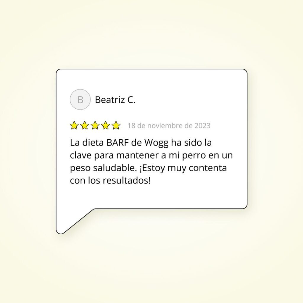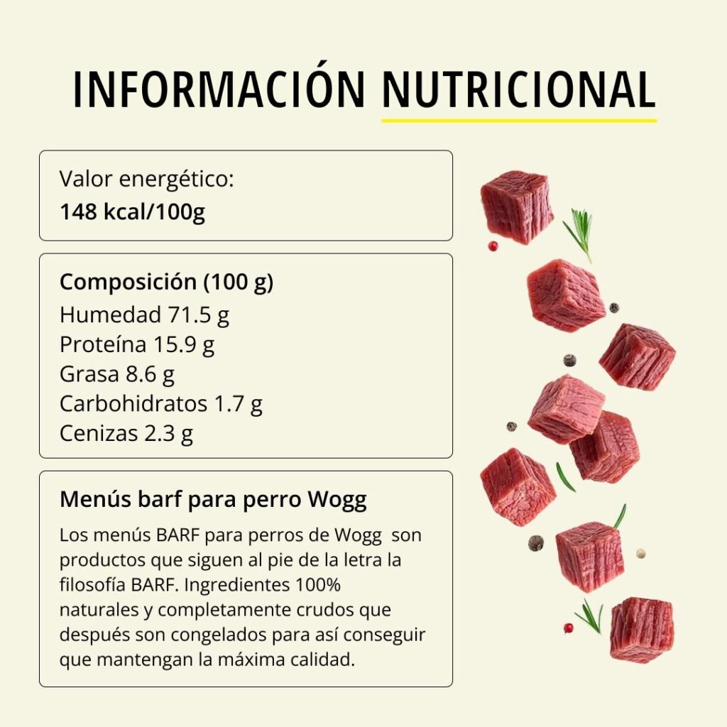 Cualquiera de nuestros menús BARF son totalmente completos. ¡Y deliciosos! Sea como sea, nuestra proporción de carne y verduras hará que cualquier Menú BARF de Wogg sea 100% completo para tu perro.