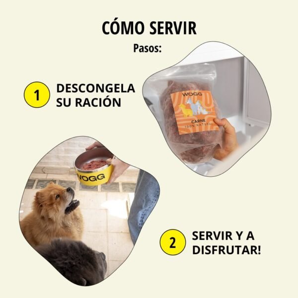 El producto no hay que cocinarlo, el alimento BARF se ofrece crudo. Con Wogg, solo tenés que descongelar el producto en la heladera 24h antes de utilizarlo o en la microondas (modo descongelar). Luego, tendrás que abrir el producto, poner la cantidad que necesite tu perro en su comedero y, ¡a disfrutar! Es recomendable sacarlo 10 minutos antes de su consumo para que esté a temperatura ambiente.